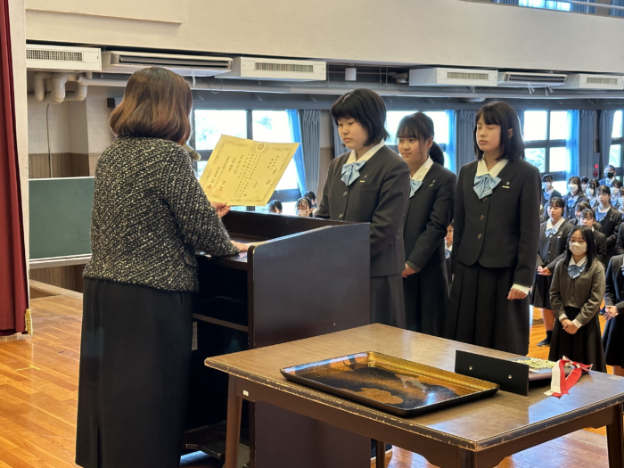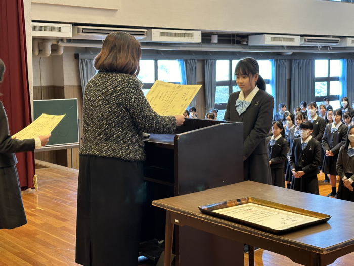 表彰のあと、最優秀賞を受賞した大橋さんが朗読を披露し、校長先生からインタビューを受けました。