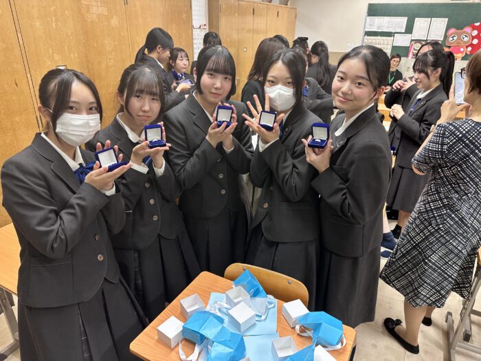 その後、ホームルーム教室に戻り、父母の会の常任委員様によるミニ指輪贈呈式を行いました。