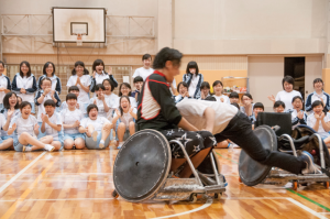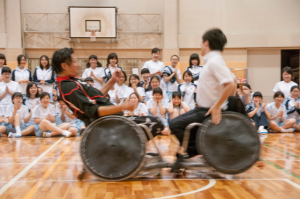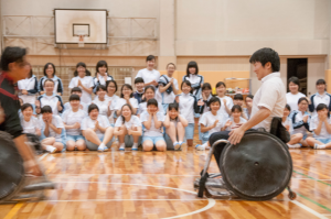 車いすでのバスケットボールの対戦、ラグビーのタックルなどを見せてもらったのに続き、生徒たちも車いすでバスケットボールの試合を体験しました。車いすに乗ったままのシュートはなかなか決まらず、見ている生徒たちも声を出して応援していました。そのあとは講師の先生方を囲んで話を聴く時間をとり、今まで知らなかったことや気づかなかったことを聴かせていただきました。