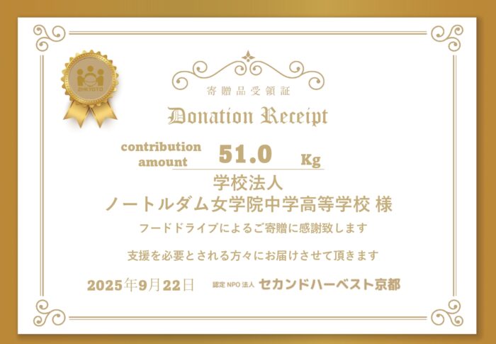皆様からお預かりした食品は、22日(月)、認定NPO法人セカンドハーベスト京都にすべてお渡しいたしました。