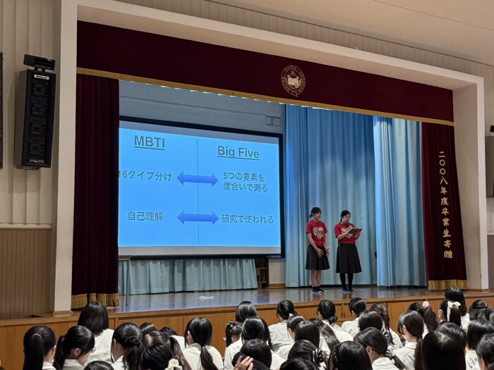 「Personality Explorer」MBTIとビッグファイブという性格診断を通して、自分自身や友達の新たな一面を見つける企画を行ってくれました。協力してくれた先生の性格をあてるクイズでは大盛り上がりでした。
