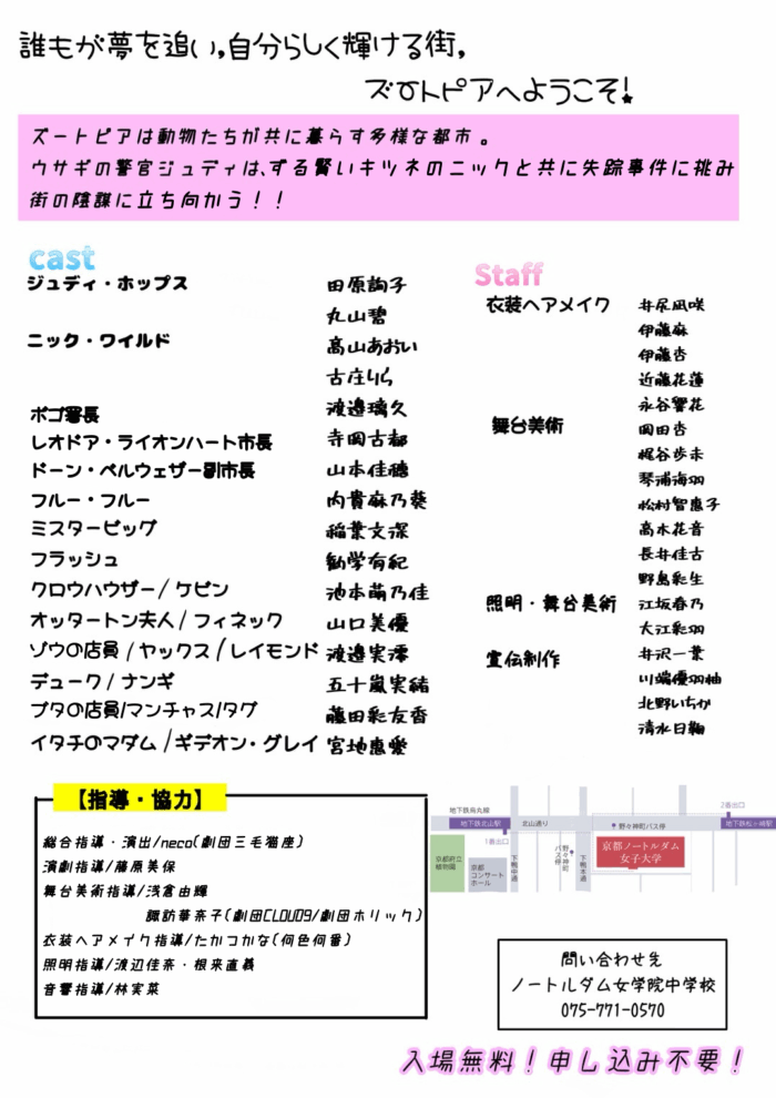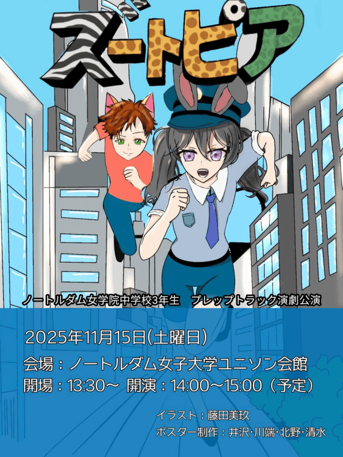 動物たちが共に暮らす多様な都市ズートピアを舞台に、ウサギの警官ジュディと、ずる賢いキツネのニックが、失踪事件の謎を追う中で街の陰謀に立ち向かう物語を、生徒たちが熱い想いを込めてお届けします。