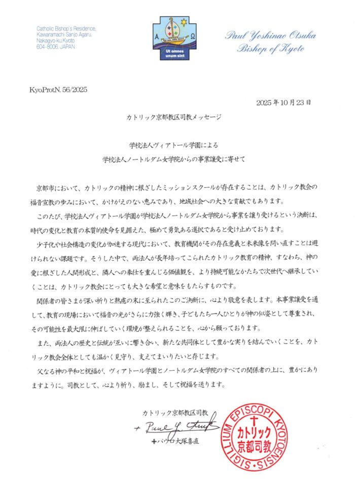 このたびの運営移行に際して、カトリック京都教区司教様からのメッセージをいただきました。