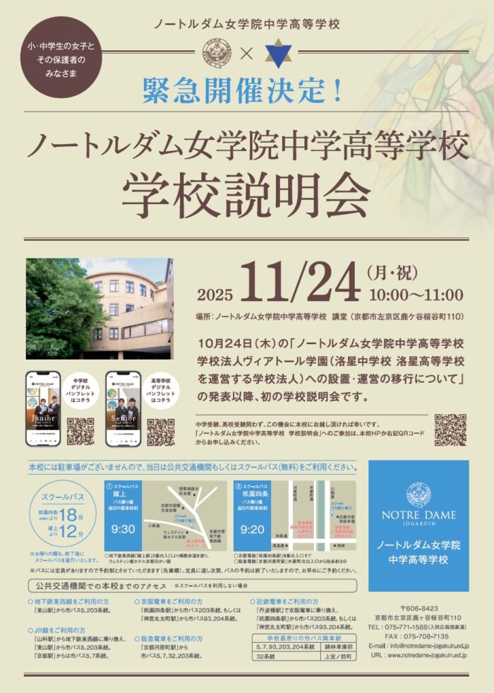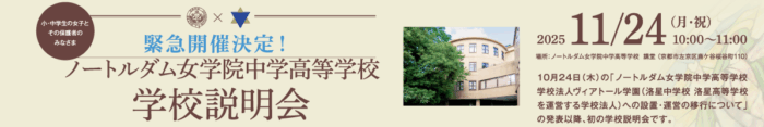 「ノートルダム女学院中学高等学校 学校法人ヴィアトール学園(洛星中学校 洛星高等学校を運営する学校法人)への設置・運営の移行について」の発表以降、初の学校説明会を、小中学生の女子とその保護者の皆様対象に開催いたします。