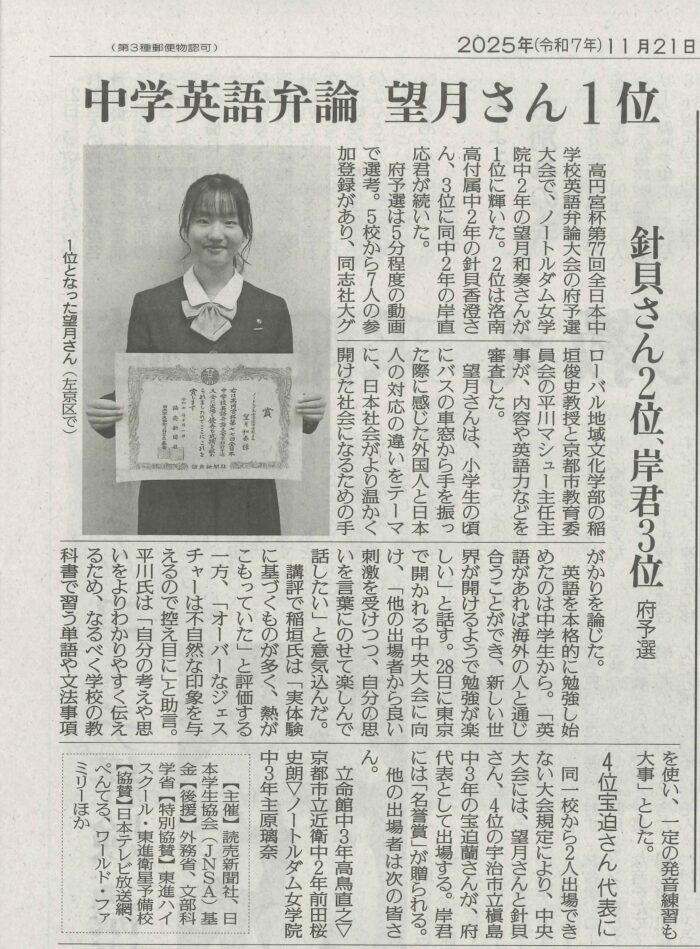 今年も、高円宮杯第77回全日本中学校英語弁論大会(府予選大会)に中学生2名(中学3年生の主原璃奈さんと中学2年生の望月和奏さん)がチャレンジしました。