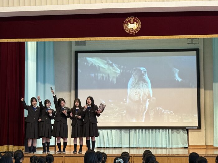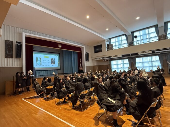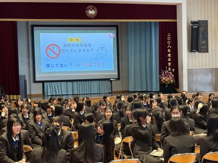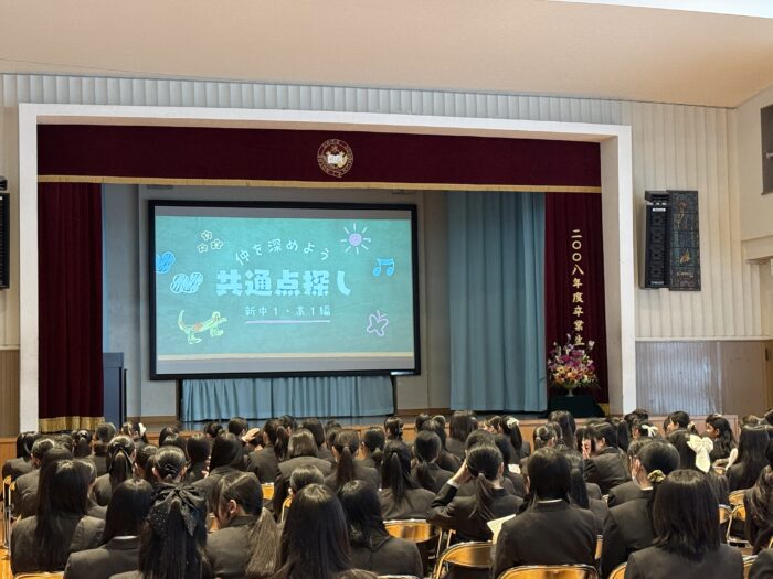 後半は、生徒会発案の「共通点探しゲーム」で、講堂は大盛りあがり!『一生髪型を変えられないとしたら、あなたは、ボブ? ロング?』『あなたが怖いのは、狭い場所? 高所?』などなど・・・