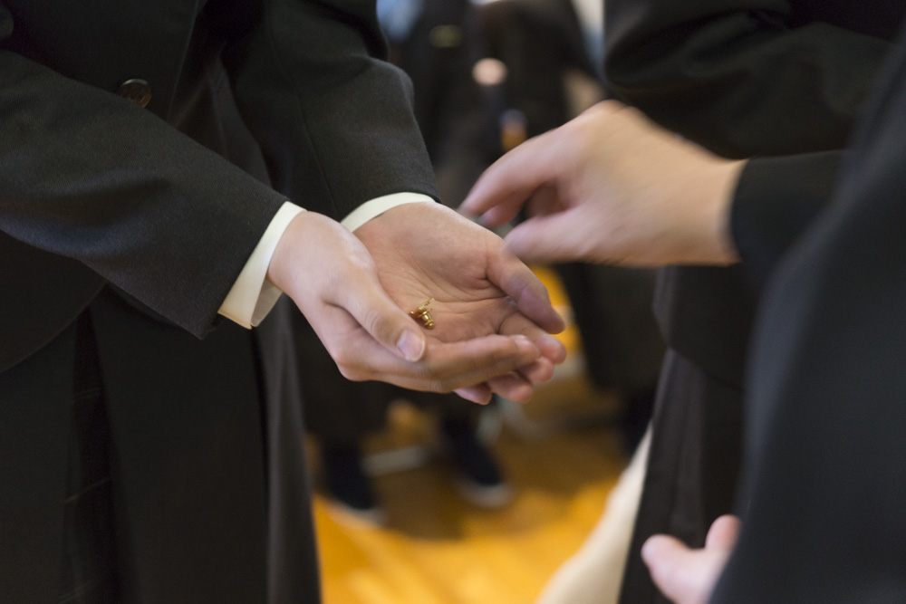 新入生は一人ひとりに学校長から校章を手渡され、これから始まる新しい学校生活に胸を膨らませていました。