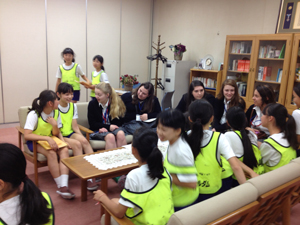 今日はセントルイスNDハイスクールのみなさんと一緒にND学院小学校と京都ND女子大学を訪問しました。小学校では6年生の英語の授業に参加して、フルーツクイズや、フレーズ対抗戦を楽しみました。大学では新築の校舎を案内していただき、授業にも参加しました。女学院に戻ってからは広島旅行の事前学習として「運命の背中」と「ヒロシマ母たちの祈り」を鑑賞しました。日本とアメリカのND生の交流いっぱいの、充実した一日でした。