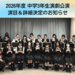 中学3年間の集大成として取り組む演劇公演。 歴代の先輩たちが繋いできた伝統のバトンを受け継ぎ、2026年度の演目がついに決定いたしました! 【これまでの歩みと、今年度の挑戦】 ● 2020年度:『Hairspray』...