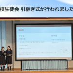 本日5限に、講堂にて高校生徒会引継ぎ式を行いました。各部会ごとにスライドを用いて前年度の報告をし、その後、新生徒会メンバーと旧生徒会メンバー間で青色のコサージュと生徒会バッジの交換をしました。 先輩の思いをしっかりと引継...