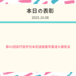 本日(10月8日(水))の全校朝礼で表彰がありましたのでご紹介します。 ◇ 第41回高円宮杯日本武道館書写書道第展覧会 ◇ 毛筆の部 大会奨励賞 高校2年生 足利心優さん毛筆の部 特選 高校2年生 柴田朱理さん毛筆の部...