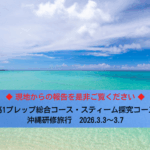 2月 27, 2026 3:15 pm Leave your thoughts3月3日(火)~7日(土)の日程で高校1年プレップ総合コース、スティーム探究コースの54名が沖縄に研修旅行に行きます。沖縄研修旅行の様子は、以下の報告ページでご覧いただけます。なお、通信状況等により更新が遅延する場合もご...